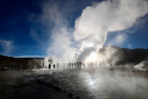 Nuestro viaje al Altiplano comienza temprano en la madrugada, para ver el amanecer en uno de los campos geotérmicos más importantes del mundo: los Géiseres del Tatio. Son más de 70 fumarolas de las que afloran chorros de vapor y forman pozas de agua hirviendo. Su mejor rostro se presenta a primera hora del día, que es cuando nacen bellos colores entre el contraste del cielo intensamente azul y el vapor prístino de los géiseres.